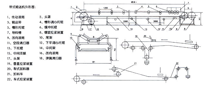 電氣保護(hù)可設(shè)有:輸送帶跑偏監(jiān)測(cè)器;輸送帶打滑監(jiān)測(cè)器;輸送帶縱向撕裂信號(hào)監(jiān)測(cè)器;料位控制監(jiān)測(cè)器等。帶式輸送機(jī)外形圖